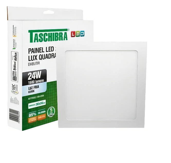 Painel de Led Taschibra Quadrado de Embutir 24W 6500K Bivolt Todos os nossos produtos são novos e originais, acompanham nota fiscal, que é enviada juntamente com a sua compra. Características do produto: - Marca: Taschibra - Único: único - Dimensões AxLxP (mm): 295x295x15 - Frequência: 50/60 Hz - Cor: Branco - Garant.: 1 ano junto ao fabricante - Grau de Proteção: IP 20 - Ângulo de Abertura: 120º - Eficiência Luminosa: 70 lm/W - Fator de Potência: > 0,5 - Fluxo Luminoso: 1680 lúmens - Formato: Quadrado - Potência: 24W - Tonalidade da Luz: Branca - Vida Útil: 20.000 horas - Modelo/Tecnologia: LED Embutido - Temperatura da Cor: 6500K – Branco Frio Acompanha o produto: 1 Painel de LED Taschibra Nota Fiscal (NF-e)